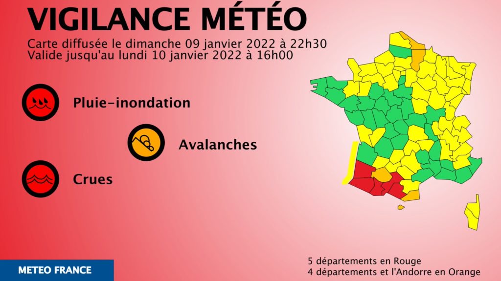 2 days ago5 départements ont été placés en vigilance rouge crues et pluie-inondation par Météo France ce dimanche 9 janvier. LAriège la Haute-Garonne les Hautes-Pyrénées pour lOccitanie ainsi. Attention si vous habitez dans le.